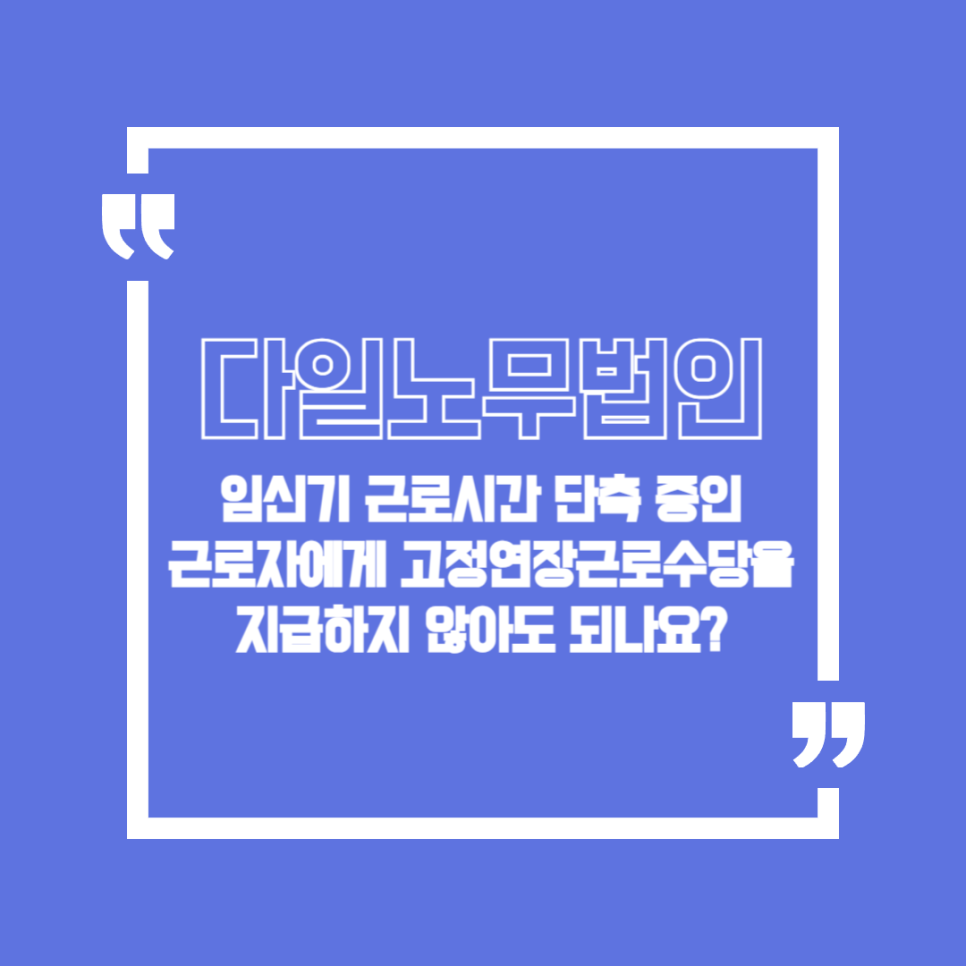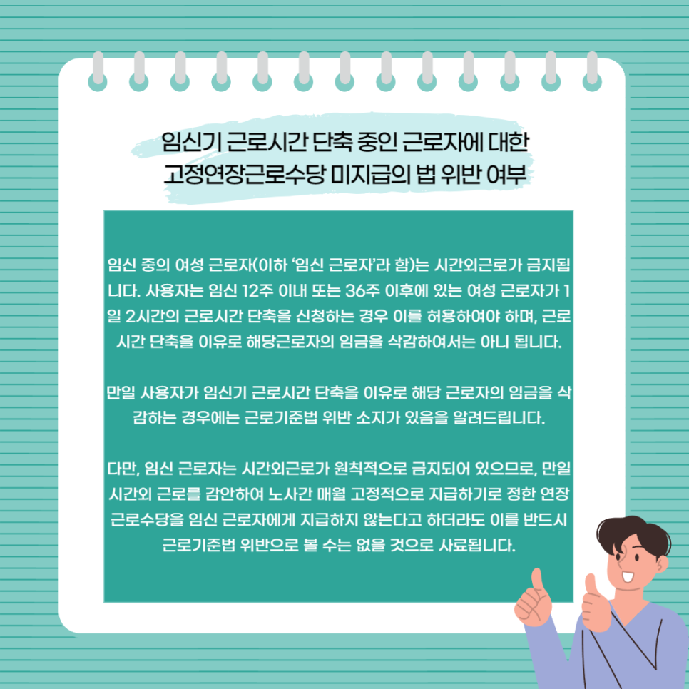 이번 시간에는 임신기 근로시간 단축 중인 근로자에 대한 고정연장근로수당 미지급의 법 위반 여부에 대해서 안내해 드립니다.
