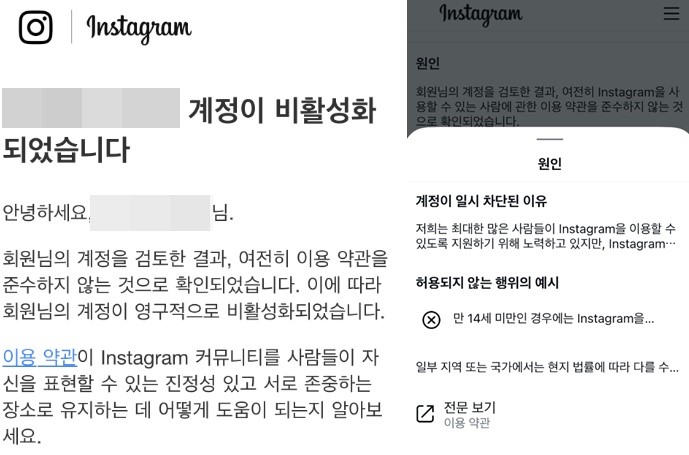 2. 문제 해결 : 인스타그램 비활성화 이유 - 만 14세 미만 사용자 관련 정책 위반