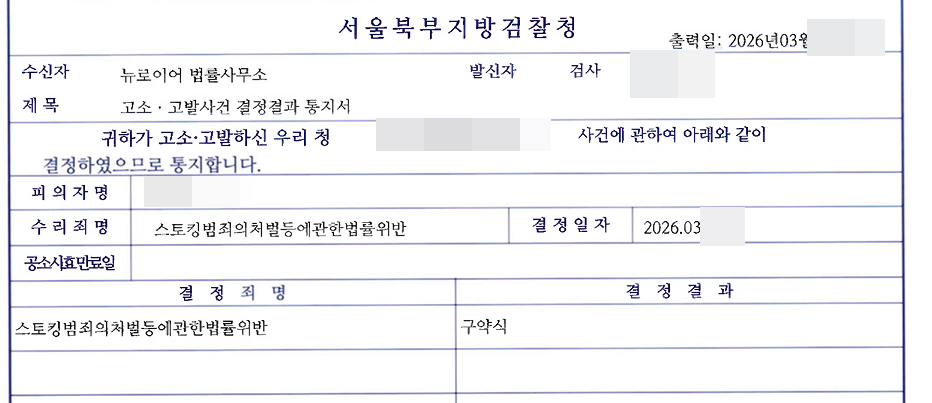 특히 차단 후 새 계정을 만들어 재접촉한 행위, 카카오톡 선물하기로 우회 접근한 행위까지 빠짐없이 증거로 확보하였습니다. 온라인과 오프라인, 직접 접근과 우회 접근을 모두 유형별로 정리해 제출함으로써 이것이 단순한 감정 표출이 아닌 지속적이고 계획적인 스토킹 범행임을 명확히 드러낼 수 있었고, 그 결과는 다음과 같이 이어졌습니다.
