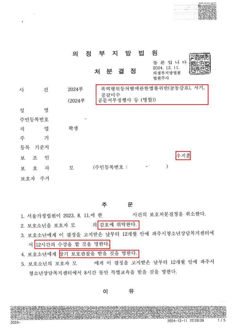 법원은 변호인의 주장을 받아들이며, 본건을 소년보호사건으로 송치하였고, 이에 따라 1호, 2호, 5호 보호처분를 받을 수 있었습니다.