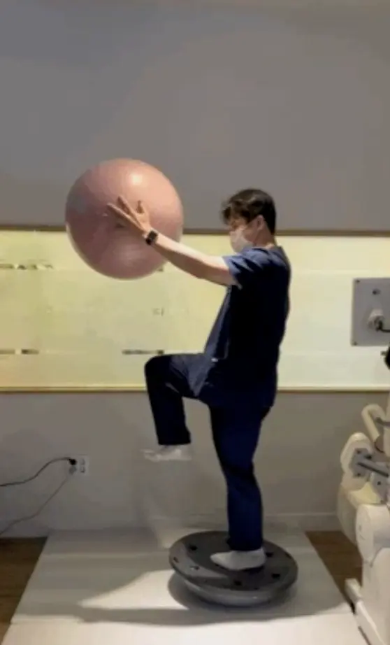 그 후 통증이 없다면, 아래 사진처럼 불안정한 지지면에서 균형을 잡는 운동이 도움이될 수 있습니다.