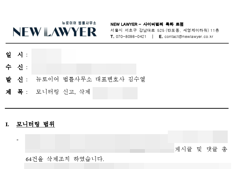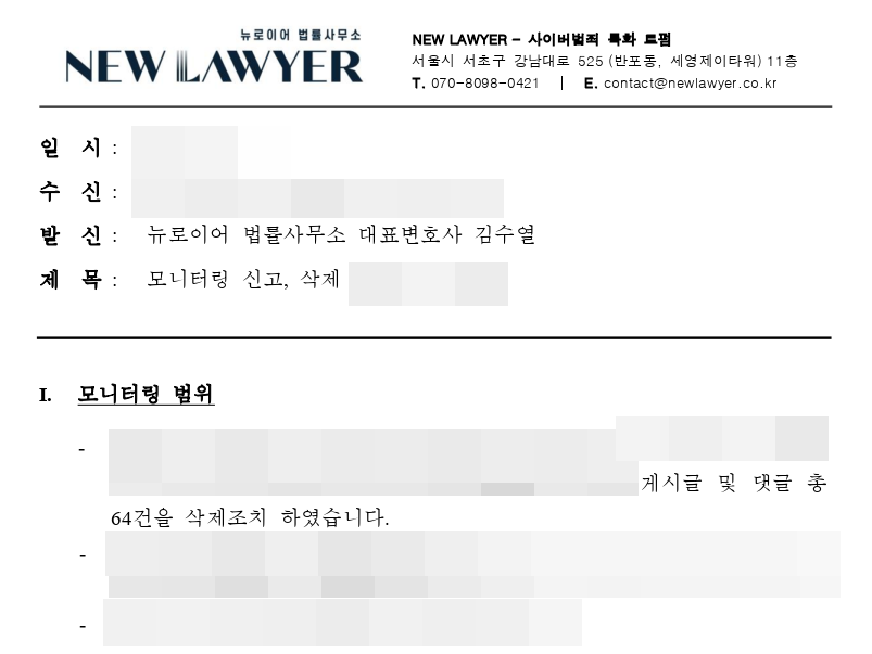 모니터링 결과 게시글 40건, 댓글 201건을 확인할 수 있었고, 이 중 의뢰인분이 삭제를 요청한 총 64건의 게시글 및 댓글에 대해 삭제 조치를 완료했습니다.