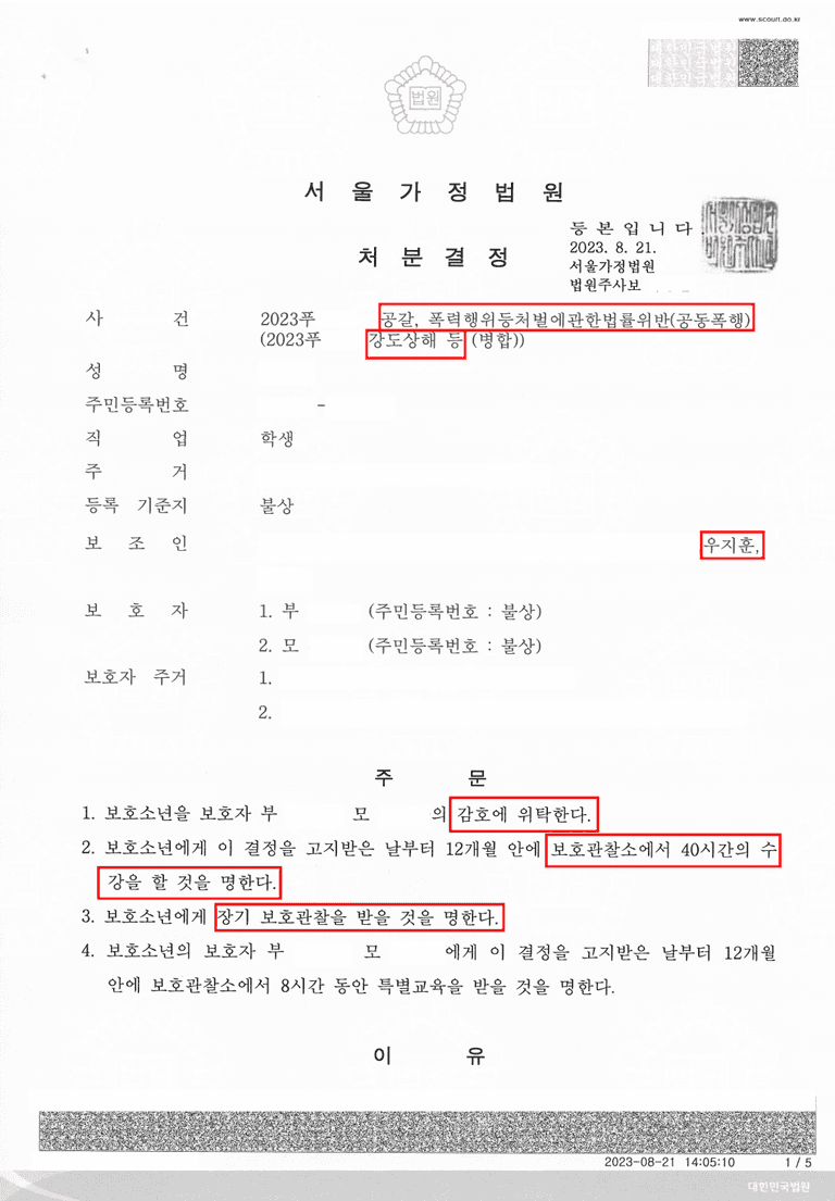 법원은 변호인의 주장을 받아들이며, 본건을 소년보호사건으로 송치하였고, 이에 따라 1호, 2호, 5호 보호처분를 받을 수 있었습니다.