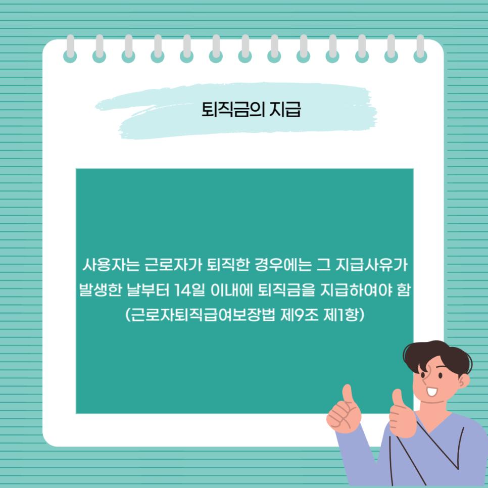 「근로자퇴직급여 보장법」 제9조 제1항 본문에서는 “사용자는 근로자가 퇴직한 경우에는 그 지급사유가 발생한 날부터 14일 이내에 퇴직금을 지급하여야 한다”고 규정하고 있습니다.