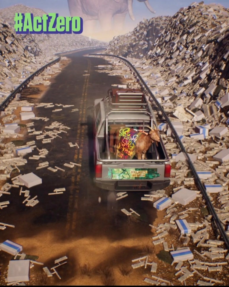 작품에서의 블랙프라이데이 다음 날 세상은 택배상자, 플라스틱 등 여러가지 쓰레기가 쌓여 산을 이루고 있다. 걸어가기도 힘들 정도록 길에도 널브러져있는 쓰레기들을 피해 지나가기 위해 메타염소 해리는 무언가를 해야한다. 이 많은 쓰레기를 처리하기 위해서는 소각하게 되면 대량의 온실가스와 탄소를 배출하게 된다. 그래서 우선 이 곳을 빨리 지나기 위해 해리는 자동차를 타고 덜컹거리는 길을 지나간다. 그나마 길 한가운데는 쓰레기가 치워져있다. 하지만 그 길의 끝에는 커다란 코끼리가 길을 막고 있다. 아주 커다란 글씨로 Zero waste를 위해 디지털쓰레기를 청소하라고 말한다.