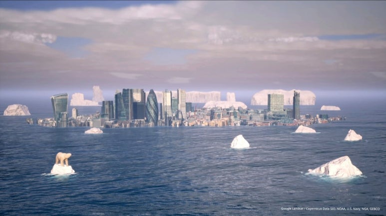 #SinkingCities#London에서는 겨우 몸만 가눌 수 있는 얼음조각 위에 선 북극곰의 모습과 저멀리 보이는 빙하, 그리고 런던 도시의 정경을 보여주면서 북극곰의 터전이 사라지고 있는 기후온난화의 현실을 지적하며, 이후 북금곰의 모습은 사라지고 런던이 바다 속으로 가라앉는 충격적인 모습을 보여주며, 기후온난화는 비단 북극해 바다에서만 벌어지는 일이 아니라 우리가 살아가는 현실공간 어디에서도 동시에 일어나고 있는 현상이라는 것을 각인시키며 그 심각성을 강조한다. 첫 장면의 도시 위에 있던 구름 대신에 바닷 속으로 가라앉고 난 후 런던 도시 위를 마치 구름처럼 떠다니는 남은 빙하의 모습이 희미해진 도시의 풍경처럼 미래를 암울하게 상상하게 한다. 그리고SinkingCities를 위해 해수면이 아니라 "RaiseYour Voice"하라는 외침이 간절하게 들린다.