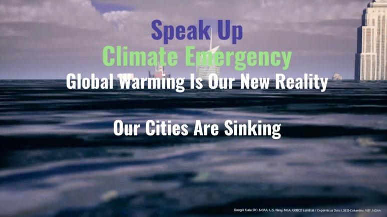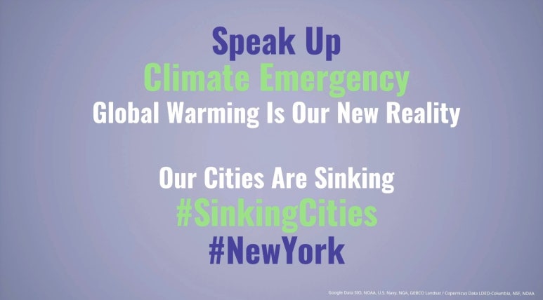 바다 아래로 가라앉은 NewYork의 모습은 숨막히듯 바다안개가 자욱하다. 우리의 도시가 가라앉고 있음을 심각하게 이야기하고 있고, 결국 도시의 모습은 사라지고 우리에게 간절한 메세지만 남긴다. 마찬가지로SinkingCities를 위해 해수면을 높이지말고 "SpeakUp" 하라는 메아리가 남는다. 그리고 이것은 가상의 허구가 아니라 우리가 마주한 New Reality라고 단언한다.