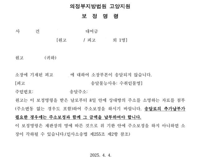 - 가압류·가처분법률Q. 채무자에게 지급명령을 신청하려합니다첫 전세 계약 2년 후 재계약을 하며 보증금 일부 감액이 되어야 했으나당시 집주인이 돈이 없다 하여 감액되는 일부분은 차용증을 작성하고 채무 변제 기한을 주었으나 이를 이행하지 않아 지급명령을 진행하려 하는대요해당 부동산 실질적인 관리는 그 집 며느리가 하고 있고집주인은 그 며느리의 시어머니로 현재 요양원에 있습니다차용증 작성 당시 며느리가 요양원에서 시어머니를 대려와서 부동산에서 만나 서면으로 작성하였습니다 (집주인이 직접 발급 요청한 인감증명서 보유 중)또한 차용증에 연대보증인으로 며느리의 이름과 싸인을 같이 기입했습니다 (주민등록번호 모름)이로 인해 처음 집주인의 이름만을 적어 거주지에 나오는 내용증명을 보냈을 때 수취인불명으로 반송이 되었으며 이후 2차 내용증명에 며느리의 이름까지 같이하여 보냈을 땐 수취거부로 반송이 되었습니다이러한 관계로 지급명령을 진행하며 보정 명령으로 채무자의 초본을 받아도 해당 거주지에서 거주하고 있지 않을 확률이 굉장히 높아 보입니다이러한 경우에는 어떻게 진행해야 할까요 ?