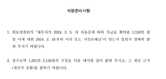 - 가압류·가처분법률Q. 채무불이행 관련하여 부동산 가압류 진행 중 석명준비명령을 받았습니다위와 같은 석명준비명령 등기를 받아아래와 같은 답변을 적어 전자소송 -> 답변서에 제출 하였습니다여기서 궁금한점이 처음 소송서류입력에서도 위 파일을 업로드 하였으며그 다음 입증/첨부서류에서도 석명준비명령에서 따로 입증 할 자료를 요청하지 않아같은 파일로 업로드를 하였습니다이렇게 해도 되는걸까요 ?처음 하는 가압류 신청이라 너무 어렵습니다이외에 차용증등 모든 증거 서류는가압류 신청 당시에 이미 첨부한 상황입니다