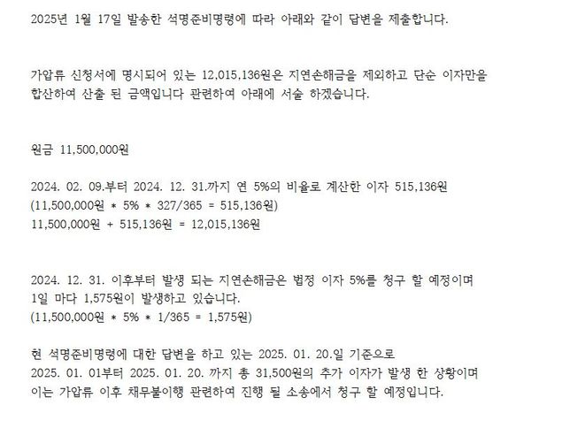 - 가압류·가처분법률Q. 지급명령은 신청하려 합니다 (이자 문의)우선 간략하게 채무가 발생하게 된 원인을 적겠습니다20220210 ~ 20240209 첫 전세 계약 (1억 1500만원)20240209 2년 연장을 위해 재계약을 하려 하였으나HUG 보증 보험 가입 요건을 맞추기 위해보증금을 1억 350만원까지 낮춰야 재계약이 가능하여 1150만원 감액 및 환급 요청 임대인이 돈이 없다하여우선 감액 된 1억 350만원으로 임대차계약서 작성 후돌려 받지 못한 보증금을20241231 까지 1150만원 + 연이자 5% 조건으로 채무 변제 기한을 주었으나 이를 현재까지 이행하지 않았습니다 (해당 부동산 압류 집행 완료)이로 인하여 지급 명령을 신청하려 하는데지연손해금 이자 총 합을 어떻게 선정해야 할까요 ?(이자 몇 %, 지연 손해금 몇 % 이런식으로 알려주시면 너무 감사하겠습니다)또한 지급 명령은 2월 진행 할 예정이지만지연손해금은 20241231일 이후 부터 계산하면 되는게 맞을까요 ?답변 부탁드립니다