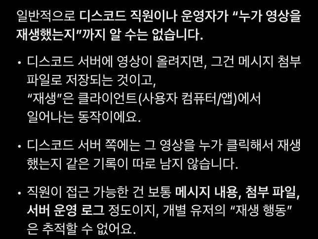 - 전기·전자학문Q. 이러한 것은 기록 되는 것이 아니죠??밑에 사진 처럼 디스코드방에 누가 영상을 올렸을 때 그 영상을 것을 시청 했을 때 시청한 것이 기록 되거나 하지않아서 디스코드 관계자라도 그러한 것은 기록되지않아서 그러한 기록 까지는 확인하기 어렵죠? 시간도 3년 정도 지났을 경우