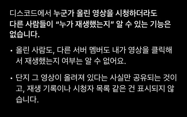 - 전기·전자학문Q. 디스코드 서버에서 있는 영상 시청 여부디스코드 서버에서 누군가 영상을 올렸을 때 그 영상을 시청하면 남들이 제가 영상을 재생시킨 것을 알 수 있나요? 그러한 기능은 일반적으로 없죠? 밑에 개시된 사진 말이 맞나요?