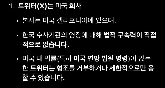 - 기타 법률상담법률Q. 영장이 있다고 해서 무조건 협조 해야하는건 아닌가요?트위터에서 일어난 범죄를 수사하기 위해 영장을 발부 했지만 영장이 발부 되었다고 해서 해외에 회사가 있는 트위터 측은 꼭 무조건 협조 할 필요는 없나요? 거부 할 수 있나요?