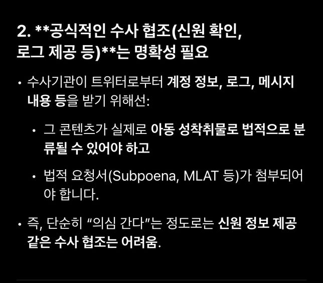 - 기타 법률상담법률Q. 아동•청소년임이 명확하지 않으면 협조가 어렵죠?트위터에 올라온 음란물에 제목에 고딩,학생등의 언급이 있고 영상에 나오는 사람이 교복을 입었지만 명백히 아동•청소년이라고 볼 수 없을 때 영장이 나오기 어렵고 만약 나오더라도 트위터 측은 명백히 아동으로 볼 수 없기 때문에 협조 해주는 것은 쉽지 않죠?