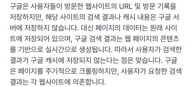 - 전기·전자학문Q. 그럼 구글은 이런 것을 저장하지않나요?구글은 사이트 방문기록은 저장하지만 그 사이트에서 검색 결과나 캐시를 구글에서 저장하지않고 해당사이트에 저장된다는 말인가요?