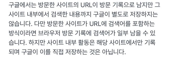 - 전기·전자학문Q. 구글 방문 기록에 대해 추가 질문이 있습니다사진과 같이 답변을 받았습니다. 방문한 사이트만 뜨긴 하지만 방문한 사이트의 url에 검색 내용이 포함 되어있다면 저장될수 있나는건가요? 아니면 검색한 것이 url이 되어 구글에 저장 될 수 있다는건가요?
