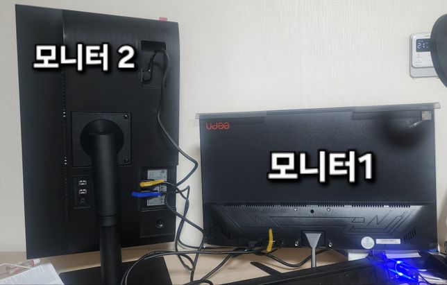 - PC 주변기기디지털·가전제품Q. 듀얼모니터 케이블 설치했는데 알맞게 한건가요?보기 쉽게 색칠해놨습니다.똑같이 노란색으로 칠한단자가 연결한 부위입니다.노란색단자가 HDMI TO RGB 케이블이에요 서브 모니터2를 확대했습니다. 노란색으로 칠한 케이블은 모니터 1에 연결했어요 서브모니터 2 파란색으로 칠한단자를 본체 HDMI에 연결했습니다. 알맞게 연결한것같은데 전원이 안켜져요. 일단 잘 맞게 연결한게 맞나요?