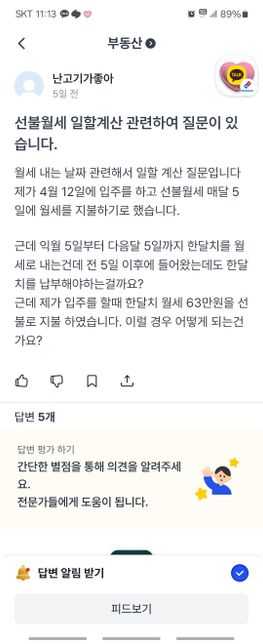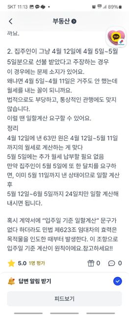 - 부동산경제Q. 월세 내는 날짜 관련해서 일할 계산 질문입니다제가 4월 12일에 입주를 하고 매달 5일에 월세를 지불하기로 했습니다.근데 익월 5일부터 다음달 5일까지 한달치를 월세로 내는건데 전 5일 이후에 들어왔는데도 한달치를 납부해야하는걸까요?