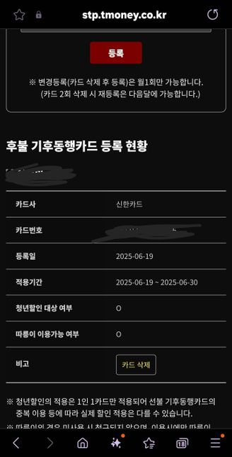 - 생활꿀팁생활Q. 후불기후동행카드 사전등록에 관하여어제 신한카드로 신한체크후불 기후동행카드를 받아서 티머니 홈페이지에 등록하고 썻는데 후불기후동행카드 사전등록이라고 카드기에 계속뜨는데 적용이 안되는건가요?