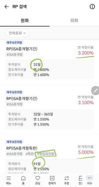 - 예금·적금경제Q. isa(rp중개형) 문의드립니다.31일 기간 선택시 이율이 313,282원91일 기간(특판-영업점) 484,503원 인데여. 궁금한것은 31일 선택시 한달 지난 후 다시 가입하면 같은 이자를 또다시 받을 수 잇는건가여?그럼 매달 반복해서 가입하면 91일 특판상품보다 더 나은거 아닌가여?