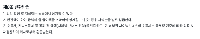 - 임금·급여고용·노동Q. 샤이닝 보너스 반환방법 문의드립니다.회사 입사 시 200만원 샤이닝 보너스를 지급 받았습니다.1년 다니고 퇴직하려고 하는데 반환 방법이 첨부한것처럼 지급하는 월급에서 상계된다고 기재되어있는데그렇다면 월급이 500이라고 하면 200만원 제외하고 월급을 준다는 걸까요?그러면 퇴직금 계산 시 퇴직금도 적어지는 건가요??답변 부탁드립니다.감사합니다.