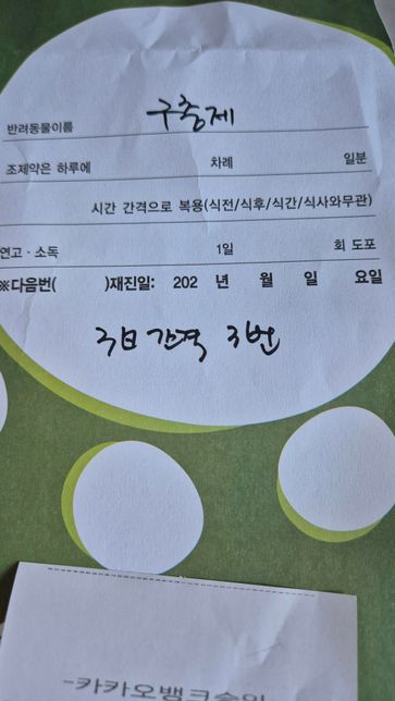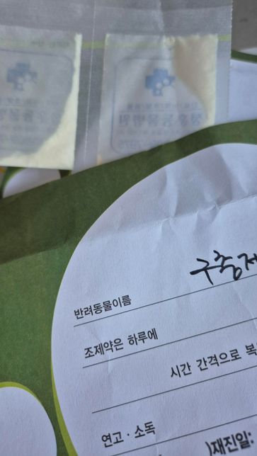 - 반려동물 건강반려동물Q. 강아지 구충제 가루약 복용 질문!!!병원에서 구충제 받아올 때 3일 간격 3번 주라고 들었거든요. 그래서 3일마다 하나씩 주는거냐 물었을 때 그게 아니라 삼일마다 아침 점심 저녁에 주면 된다고 들었어요.그런데 오늘 약 주고나서 봉투 안에 보니까 가루약이 두개밖에 안들어있네요... 3일마다 3번인데 약이 총 세개만 들어있는건 말이 안되는것 같아서요. 혹시 가루약 하나를 소분해서 아침 점심 저녁으로 주라는 뜻이었을까요? 가루약을 병원에서 이런식으로 알아서 소분하게 통째로 3개 주기도하나요? 아니면 3일에 하나씩 주라는거 제가 잘못들은 확률이 더 높을까요..? 지금 모르고 하나 다 한번에 먹여버렸는데 괜찮을까요?