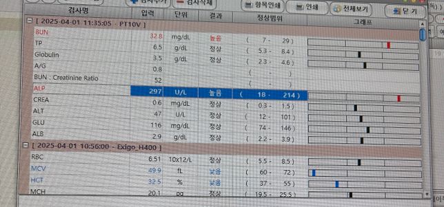 - 반려동물 건강반려동물Q. 빈혈 원인을 모르겠는 상황인데요 !!아까 올린글에 사진을 못올려서 다시 질문합니다 중성화 전 검사에서 HCT 수치가 너무 낮아 미루고 돌아왔습니다 근데 보통 이게 낮으면 뭐 연관되는 다른 수치도 같이 낮은경우가 대부분인데 유독 이것만 낮은건 흔하지 않다고 하셔서 아직 원인 파악을 못했습니다. 일주일 철분제를 우선 복용후 재검뒤 정상이면 중성화수술 진행 하기로 했는데 여전히 낮으면 수혈을 생각하고요 지금 어떤 상황인듯 하나요 ㅠ? 오늘 수술안한것은 잘한거 맞죠? 철분제 일주일 먹고 수치 돌아오면 바로 수술 진행하는게 괜찮은 선택일까요 ..?