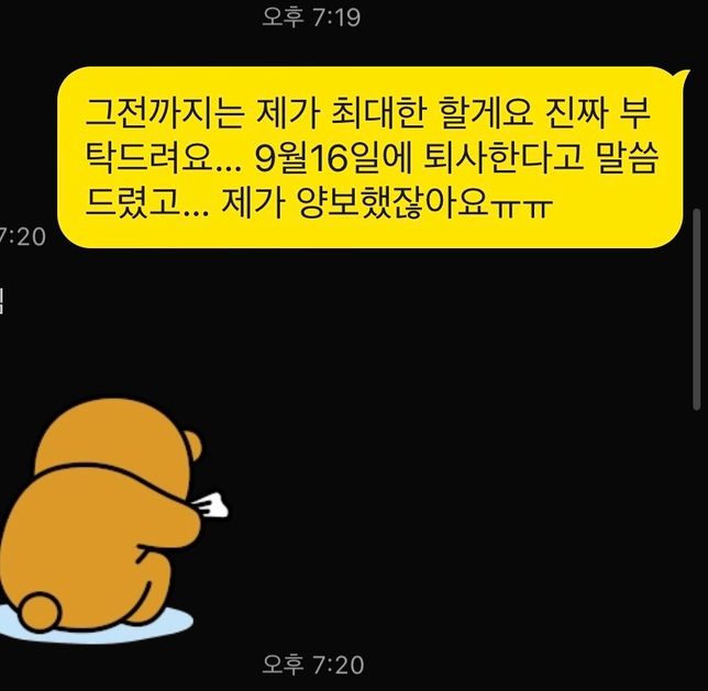 - 근로계약고용·노동Q. 과거에 퇴사한다고 의사를 표현했는데, 회피의답변과 이모티콘으로 답이온다면?제가 과거에 회사를 퇴사한다고 통보했더니, 계속 회피만 하는상황입니다. 그래서 이전카톡 내용을 보던중 찾은건데 사진을보면 저는 의사를 표명했다와답변으로는 이모티콘으로만 답변을 합니다.이런상황이면 저는 9월16일에 통보의 의지를 보였다 볼수있나요?