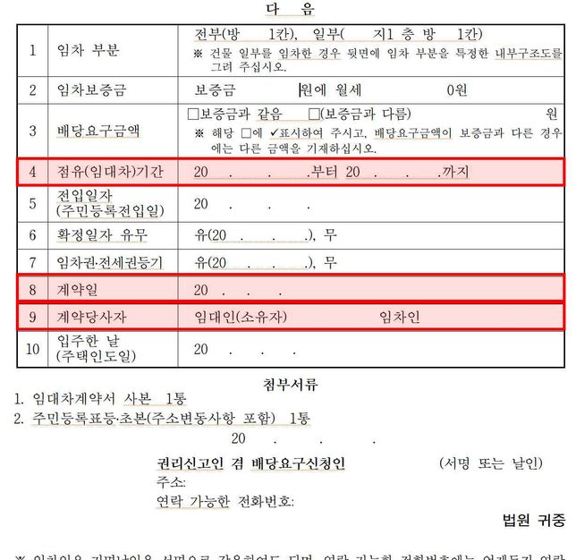 - 부동산경제Q. 배당요구신청서 몇가지 질문이있습니다.빨갛게 표시해둔 부분이 궁금한데요 4번에 임대차 기간은 첫 계약일부터 묵시적연장 계약일까지 통으로 적는건가요 ? 아니면 나눠서 적나요 ?8번은 제가 월세에서 전세로 넘어갔는데 두개다 적으면 될까요 ?9번이 제일 중요한데... 계약서상의 임대인을 적는건가요 아님 현임대인을 적ㄴ느건가요 ?(중간에 임대인이 변경되었습니다.)