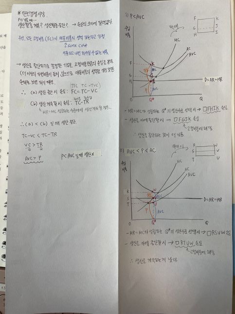 - 경제용어경제Q. 완전경쟁시장 생산 중단할지 말지 결정할 때 기준이 되는 손실 크기 구하는 법안녕하세요.완전경쟁시장에서 모든 고정비용이 매몰비용의 성격을 갖는다고 가정했을 때 손실의 크기를 구하는 법에 대해 질문드리고 싶습니다.첨부한 사진은 경제학원론(이준구,이창용)을 참고하여 그린 그래프입니다.해당 사진과 함께 질문내용을 봐주시면 감사하겠습니다. 1. 책에서는 AC와 P사이의 길이도 ‘손실’이라 표현하고, 수량까지 곱하여 나타낸 면적(예를들어, 사각형 FHIK)도 ‘손실’이라고 표현하던데 둘 다 맞는 표현인건가요? 큰 차이는 없고 수량을 곱하지 않은 손실, 수량을 곱한 손실인 것 뿐인가요? 2. 해당 내용을 공부하다 보니, 이윤인지 손실인지 알고싶다면 P와 AC를 비교해보고, 생산을 계속 할지 말지를 결정하고 싶다면 P와 AVC를 비교해보면 된다는 것을 알 수 있었습니다.다만, 이윤인지 손실인지 알고 싶을 때 왜 P와 AC를 비교해야하는 것인지 잘 이해가 가지 않습니다.기업의 이윤은 TR(총수입)에서 TC(총비용)을 뺀 것이고, 이를 미분한 것이 MR-MC로 이윤극대화 조건이 된다고 알고 있습니다.그런데 왜 완전경쟁시장에선 이윤, 손실을 따질 때 MR과 MC가 아닌 P와 AC를 비교하는 것일까요?물론 완전경쟁시장에서는 P가 MR과 항상 같기에 MR은 P로 대체할 수 있을 것 같은데 AC는 어디서 튀어나오는 건지 궁금합니다.3. 마지막으로 이윤인지 손실인지 알고 싶을 때 p와 ac를 비교해보는 것은 완전경쟁시장에서만 그런 것이 아니라 모든 시장에서 그러한 것인가요? 감사합니다.