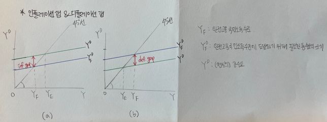 - 경제용어경제Q. 케인즈 국민소득 결정이론. 인플레이션 디플레이션 갭.안녕하세요. 케인즈 국민소득 결정이론 관련하여 질문드려요.첨부한 사진과 함께 질문 내용 봐주시면 감사하겠습니다.한 경제 책을 보면 사진과 같은 그래프에 대해 다음과 같은 설명들이 나옵니다.1. 현실의 총수요 수준이 완전고용을 달성하기 위해 필요한 총수요 수준에 비해 작을 때 그 차이를 디플레이션 갭이라 하고, 클 때의 차이를 ㄹ인플레이션 갭이라 한다. 2. (a)는 인플레이션 갭의 사례이다. 이는 완전고용 국민소득수준에서 총수요가 총공급을 초과하는 경우이다.3. (b)는 디플레이션 갭의 사례이다. 이는 완전고용 국민소득수준에서 총수요가 총공급에 미달하는 경우이다.1의 설명은 이해가 가는데, 2와 3의 설명이 잘 이해가 가지 않습니다.1의 설명 방식처럼 ‘현실의 총수요 수준’과 ‘완전고용을 달성하기 위해 필요한 총수요 수준’을 비교하는 것이 인플레이션갭과 디플레이션갭을 구할 수 있는 방식인 것 같은데왜 2와 3의 설명에서는 ‘현실의 총수요‘와 ’총공급‘을 비교하고 있는 것인가요?케인즈 관점에서는 45도선이랑 총공급을 같게 볼 수 있는 것인가요? (그래프 가로축의 국민소득 Yf와 Ye를 총공급과 같게 보는 것인가요?)설명 부탁드립니다ㅠㅠ 감사합니다.