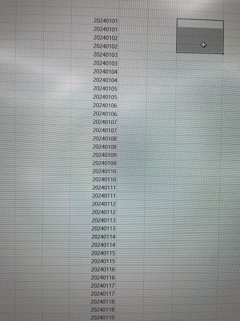 - 생활꿀팁생활Q. 엑셀고수분들 도와주실수있나요ㅜㅜㅜㅜ사진처럼 20240101 부터 20241231까지 나열을 해야하는데 두칸씩 잡고 배열을해야합니다.예를들어202401012024010120240102202401022024010320240103...이런식으로요ㅠㅠ 그래서 그냥 커서잡고 쭉 내릴수가 없는데 혹시 방법 아시는분 계신가요!ㅠㅠ
