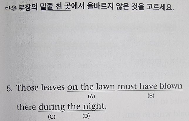 - 생활꿀팁생활Q. 사진 속 영어 5번 문제의 정답을 알려주세요사진 속 5번 문제의 정답을 알려주세요. A ,B, C, D 중 문법 적으로 틀린 부분을 찾는 문제인데 아무리 생각해도 답을 모르겠네요.