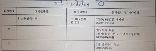 - 부동산경제Q. 등기부등본 표제부 대지권의 표시표 설명부탁드립니다.안녕하세요? 부동산 뉴비입니다. 최근에 등기부등본에 대하여 공부해보고 있는데 모르는 부분이 있어 질문해봅니다.첨부한 사진 속 대지권의 표시 표에서 왜 대지권 종류 표시번호 2번, 3번이 빈 칸이고 등기원인 칸만 작성되어있는지, 이게 구체적으로 무슨 뜻인지 궁금합니다. 도와주세요 ㅠㅠ