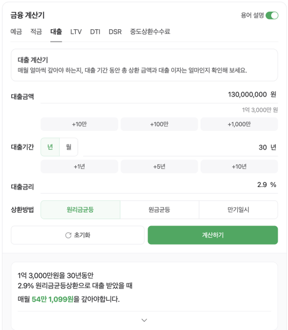 - 대출경제Q. 간단한 질문이요!! 매매대출 갚아나가는 방식 맞는지 확인좀 부탁드려요!매매 대출로 1억3천 받고... 아래 보다시피 금리2.9% 대출 기간은 30년으로 하고, 거치는 5년으로 잡은 후 이자만 내고..후에는 원리금균등으로 선택가능해서? 나머지 25년동안에는 원리금 균등으로만 갚아 나가도 되는거죠..? 25년동안 매달 54만,1,099원만 고정적으로 내면 되는건가요..?아니면 매달 내는 금액이 변동이 있을까요? 금액 변동이 있다면 크게는 몇만원 정도 오르기도 하는지..? 어느정도 오르는지 궁금합니다.. 답변 주시며 감사하겠습니다.!
