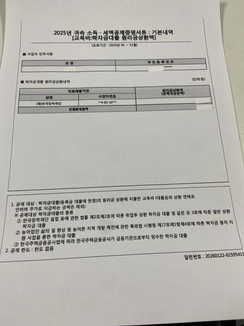 - 연말정산세금·세무Q. 연말정산 교육비에 관한 문의입니다.학자금대출 원리금상환액을 교육비 공제에 반영하기 위한 작업에 관한 문의입니다.답변 주신대로 학자금 대출이 등록금만 해당이 되는데, 해당 직원분이 등록금과 생활비가 섞여 잇다 하셔서확인을 해보니 해당 직원분이 공제신고서를 작성하는 부분에 교육비 자료에 사진을 보내주셨습니다.간소화자료상에 금액이 이미 등록금에 관한 부분만 뜬거였고, 생활비 대출은 이미 공제제외금액으로국세청에서 알아서 빼놓은 상태더라구요! 아마도 제가 이해한 부분이 맞는거 같은데 혹시나 싶어 사진과 함께 질문남깁니다.
