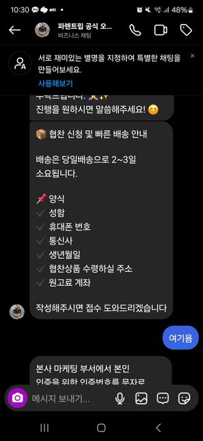 - 기타 법률상담법률Q. 협찬문의 받았는데 사기일 가능성 있나요?안녕하세요 저는 인스타를 하는 사람인데요제가 인스타에서 어떤 사람에개 협찬문의를 받았는데협찬 문의 조건문 및 협찬 접수 양식을 보니까 이런식으로 뜨고 무슨 6자리 인증을 해달라고 하길래 해줬거든요? 근데 정말 이상한게 2가지 메신저 종류가 왔어요... 이거개인정보 털어갈려고 사기칠 가능성이있을까요? 만약에 정말 그런거라면어떻게 대처해야 하나요?