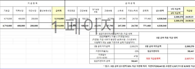 - 임금·급여고용·노동Q. 임금지연이자 계산시 문의드립니다.7/1일 퇴사일1) 5월 급여 실수령액 50% ->5/30일지급2)5월 미지급급여 남은 실수령액 50% -> 8/30일 지급 예정여기서 2)번 실수령액 기준으로 임금지연이자를 계산했는데 임금지연이자가 실수령액이 아닌세전급여 기준이라고 하지만 저희의 경우 한달 급여 전체가 미지급된게 아니라 이미 급여 산정시 4대보험 공제 및 회사에서 4대보험료 다 납부되었고위와같이 실수령액 급여 50% 1차를 지급 한건데이 경우에는 세전급여 기준이아니라 실수령액 미지급 기준으로 계산하는게 맞는게 아닐까요?추가질문 : 혹 위의 자료처럼 실수령액을 지급금액으로 임금지연이자 계산시 혹 문제가 발생될까요?