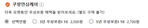 - 주방가전디지털·가전제품Q. 냉장고 구매하는데 쿠팡 안심케어 비용관련해서 문의 드립니다쿠팡에서 저렴한 냉장고를 찾아보고있는데 구매 버튼 아래에 사진같은 화면이 있더군요궁금한게 저기서 5년짜리 선택하면 2,700원이라고 되어있는데저게 보험금 다합친 금액인지 아니면 따로 계산법이 있어서 보험금을 추가로 합산해서 더 내야하는건지 궁금합니다.요약하자면냉장고 가격 + 2,700원만 내면 되는건가요?or냉장고 가격 + (2,700원 + α) 로 내야하는 건가요?