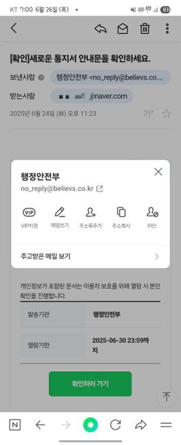 - 생활꿀팁생활Q. 이거 진짜 행정안전부 메일인가오??네이버 행안부 피싱메일 검색해보니 이상한 네이트나 희안한 메일들로 왔던데 이거는 답장 안되는 이메일로 와서 훔.... 아리까리하네요행안부진짜메일주소인가요?