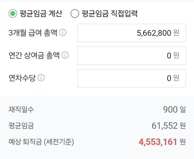 - 임금·급여고용·노동Q. 알바 퇴직금 계산 좀 해주세요 이게 맞나요?3개월 월급 합친 4대보험 안 뗀 금액(주휴수당포함)인데요 퇴직소득세 계산해도 아무것도 안 나오던데실수령액은 어떻게 될까요? 그대로 받으면 되나요?