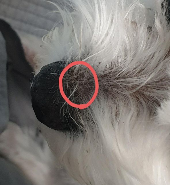- 반려동물 건강반려동물Q. 강아지 코 윗쪽이 만지면 갈라져서딱지가 생긴 것 같은 느낌이 나요.빨간색으로 표시한 부분이 만지면 갈라져서 딱지 생긴 느낌?이 나고 거기서 코 색깔의 검정색 표피 같은 게 나와서 털에 붙어있는데 왜 이러는 건가요?