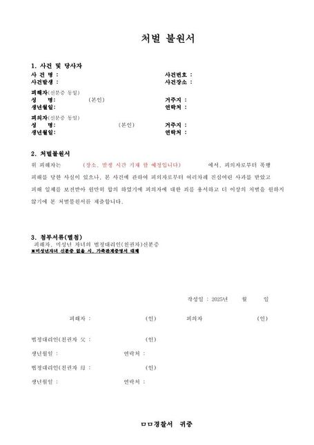 - 폭행·협박법률Q. 처벌불원서 양식 봐주세요.....곧 합의하려하구요. 폭행관련입니다. 저는 피의자(가해자)이고요이런경우가 처음이라 맞게 썼는지 잘 모르겠어서요상대는 미성년자이구요.귀화한 외국인입니다.처벌불원서 수정해야 할 부분이 있을까요처벌불원서에 양식 맨 아래 피해자 이름 서명부분은 없어도 되죠?