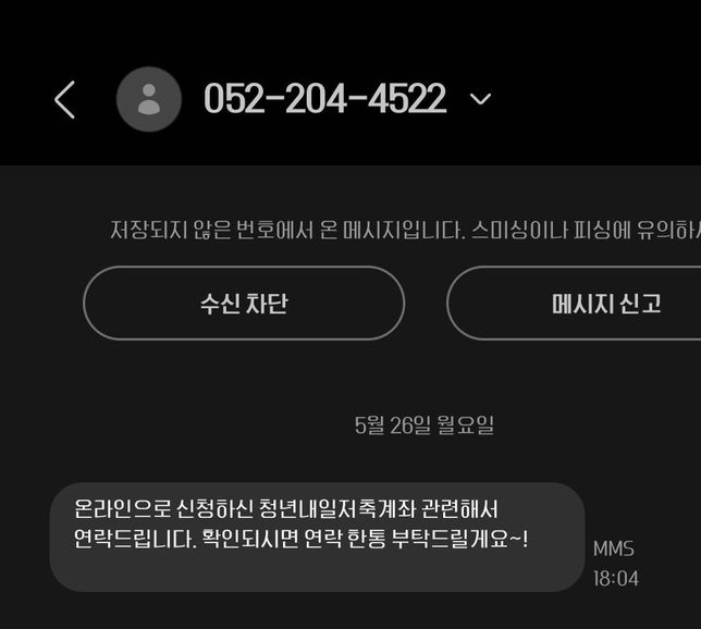 - 생활꿀팁생활Q. 0522044522 어디인가요?제가 청년내일저축계좌를 신청했었는데이 번호로 연락달라고 문자가 왔어요 근데 네이버랑 어디에 검색해봐도 어떤 기관인지 안 나와서 연락을 못하겠어요.. 어딘지 알 수 있을까요?
