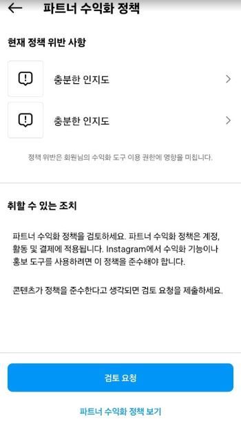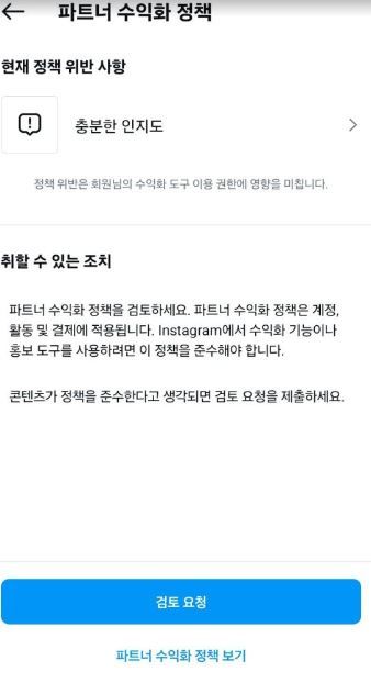 - 생활꿀팁생활Q. 인스타그램 수익화 상태 이거 무슨 뜻인가요?제가 릴스를 올리는 계정이 있고, 얼마전 릴스 조회수가 너무 안나와서 테스트삼아 계정을 1개 추가로 만들었습니다.그런데 설정에서 수익화 상태를 들어가보면요 아래와 같이 보입니다. 이게 무슨 뜻인가요? 전 딱히 정책위한할 사항도 없고 팔로우도 시작한지 얼마 안되어서 몇명 되지도 않거든요. 릴스 영상도 제가 그냥 소소하게 직접 촬영해서 올리고 있습니다.아래는 제가 테스트삼아 만든 계정인데요이 계정은 만든지 진짜 몇일 안되었고, 영상도 그냥 2개정도 일상영상 찍어서 올렸거든요.수익을 창출할수 있다고는되어 있는데 파트너수익화 정책에 1개가 표시가 되면서 들어가면 충분한 인지도가 떠 있는데요.수익을 창출할 수 있다는말은 여기에 릴수 올리면 수익이 발생된다는 뜻인가요?팔로수도 없고, 영상 조회수도 100회정도 밖에 안되거든요.인스타그램도 틱톡이나 유투브처럼 팔로우수, 조회수 충족이 되어야 수익화가 되는거 아닌가요? 수익을 창출할 수 있다는게 무슨 뜻인지 궁금합니다.상세한 답변 좀 부탁드립니다.