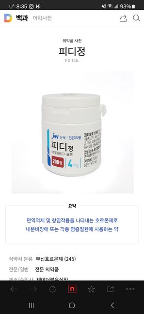 - 약 복용약·영양제Q. 지르텍과 피디정 함께 복용가능한가요?질문그대로입니다 몸에 두드리기랑 염증증상있어서 집에 상비약 먹으려고 하는데 지르텍이랑 피디정 함께복용해도 되나요?예전에 병원에서는 피디정과 항히스타민제를 함께 처방해주었습니다.