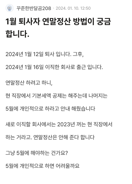 - 연말정산세금·세무Q. 1월 퇴사자 연말정산 문의드립니다 2024년 1월 12일 퇴사입니다. 그후,2024년 1월 16일 이직한 회사로 출근 입니다.분야가 달라서 사진으로 다시 남기게 되었습니다.