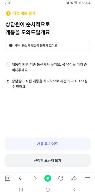 - 기타 고민상담고민상담Q. 알뜰폰 직접 개통 불가 오류 걸렸어요..아침 10:30쯤에 개통 요청 했는데 오류가 떠서 유튜브 보며 무한 대기중인데 언제 개통이 되는건지 모르겠네요.. 통신사 연결이 끊어지면 유심 교체해주려고 하는데 아직까지도 안끊기네요.. 이럴 땐 어떻게 해야 하나요?? 얼마나 기다려야 하나요??