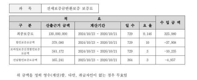 - 재산 보험보험Q. 전세보증금반환보증보험료 관해 질문드립니다.이번에 전세보증금반환보증보험에 가입을 했습니다.계약서에 명시된 임대차 계약기간은 24/10/23~26/10/22까지인데 첨부한 사진에는 보증료 계산기간이 24/10/23~26/10/21까지 기입되어 있는데 왜 그런건가요?