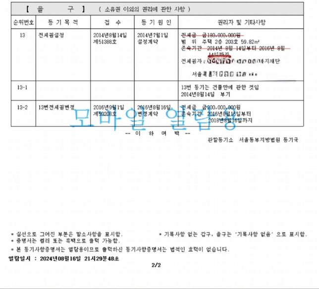 - 부동산경제Q. 계약하려는 집이 등기부등본에 전세권설정이 잡혀있는데 한번 봐주세요.반전세계약을 하려고 합니다.집은 빌라입니다.사진처럼 등기부등본에 전세권설정이 잡혀있습니다.중개사 말로는 등기부등본 문제없고 전세권설정은 현세입자가 전입신고를 하지 않아 한거라고 하네요.사진에도 보시다시피 전세권설정 존속기간도 16년~18년으로 되어 있네요.왜 24년이 아니라 18년으로 되어 있을까요? 지금 기숙사처럼 사용하고 있다고 하네요. 전세권자도 복지재단으로 되어 있구요.모자이크처리했는데 앞에 복지법인이라고 써있습니다. 전세반환보증보험도 가입하려고 하는데 주택가액도 문제 없이 가입 가능하구요.계약해도 문제 없을까요? 전문가분들의 고견을 듣고 싶습니다.